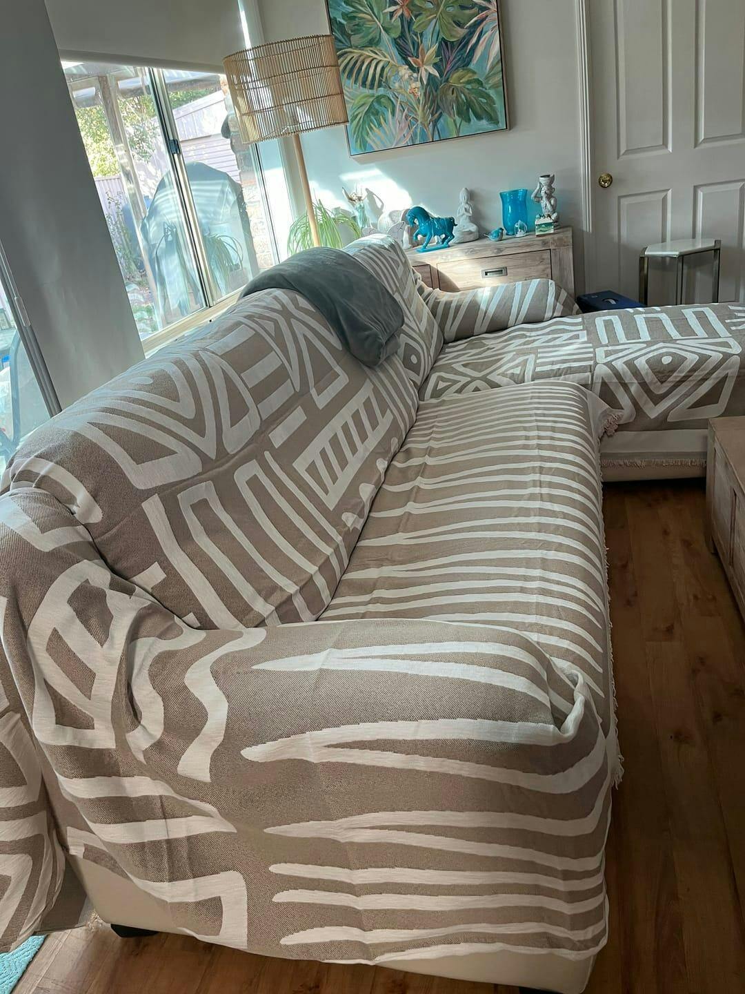 Great Fit and Looks Stylish!cover fits my two-seater couch perfectly with extra room to tuck in. The fabric is soft and the geometric design adds a modern touch. It stays in place well and covers the entire couch, even the sides. Easy to clean and totally worth it for a quick refresh!