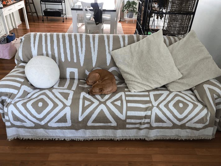 Recently bought a light gray and have three dogs that won’t stay off. This looks so much better than the random 8 quilts and blankets I had covering and more secure so more difficult for them to scratch off the couch! Feels comfy! Hope it will wash up easy! Also a nice way to change up the look! Not bad for 50% off!Update. Have had a few months now. Still love the blankets and seem to repel dog hair! I see dog hair on my pillows but can’t seem to find on the blankets unless I’m super blind. Wash up like new also! Would love to see terra cotta color or mustard yellow solids. Would buy for change up! Hint hint!!